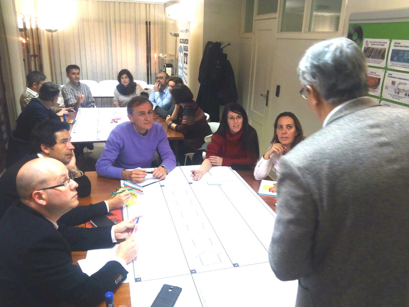 Finalizada la exposición de contenido, Luis nos invitó a pasar a la acción y, por equipos, asumimos la figura del CDO para dos casos, uno relacionado con el desarrollo de servicios para una entidad financiera y otro relacionado con la evolución de las Smart Cities. En ambos casos los participantes se enfrentaron a la dificultad de plantear una transformación digital en la que es necesario abandonar la visión del negocio tradicional y las necesidades que este cubría para atender las nuevas necesidades y poder evolucionar. Para este ejercicio los equipos se apoyaron en una metodología Canvas propuesta por Luis Lobardero y que gira entorno a la nueva cadena de valor que se genera al cruzar nuevas necesidades con nuevas tecnologías.