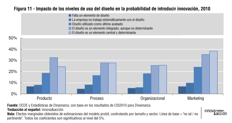 En general, lo que el gráfico muestra es que un grado más elevado de integración del proceso de diseño en la cadena de innovación de una compañía, hace que se incremente la probabilidad de terminar introduciendo elementos innovadores.