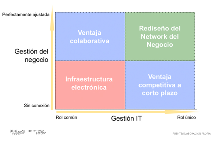 A todo ello debemos añadirle el reto, todavía pendiente, de que las organizaciones cuenten con un auténtico CIO (Chief Information Officer, en castellano asociado al Director de Sistemas) en lugar de un CTO (Chief Technology Officer, en castellano asociado al Director de Tecnología). O, lo que es lo mismo, que las empresas cuenten con una persona de negocio que conozca las tecnologías, más que con un responsable de tecnología que se incardine en el negocio. Solo así las tecnologías se convertirán en un vector adicional de éste, incorporando cuestiones como el conocimiento de tendencias, que permitan a los responsables tomar decisiones de otra forma y reimaginar el papel de la tecnología, tal y como se muestra en el gráfico siguiente.