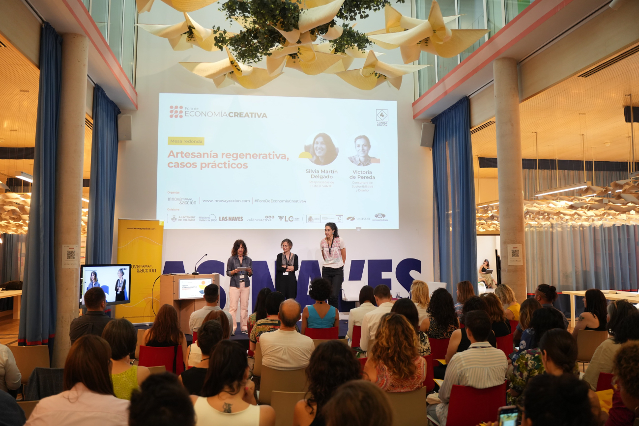 Una creatividad e innovación sostenible de la que quisieron hablarnos Silvia Martín Delgado, responsable de Fundesarte y Victoria de Pereda, consultora de sostenibilidad, a través de numerosos ejemplos y casos prácticos sobre Artesanía Regenerativa. Ejemplos que sirvieron de inspiración y guía para muchos de los asistentes, y que abren la puerta a nuevas formas de hacer artesanía para el futuro.