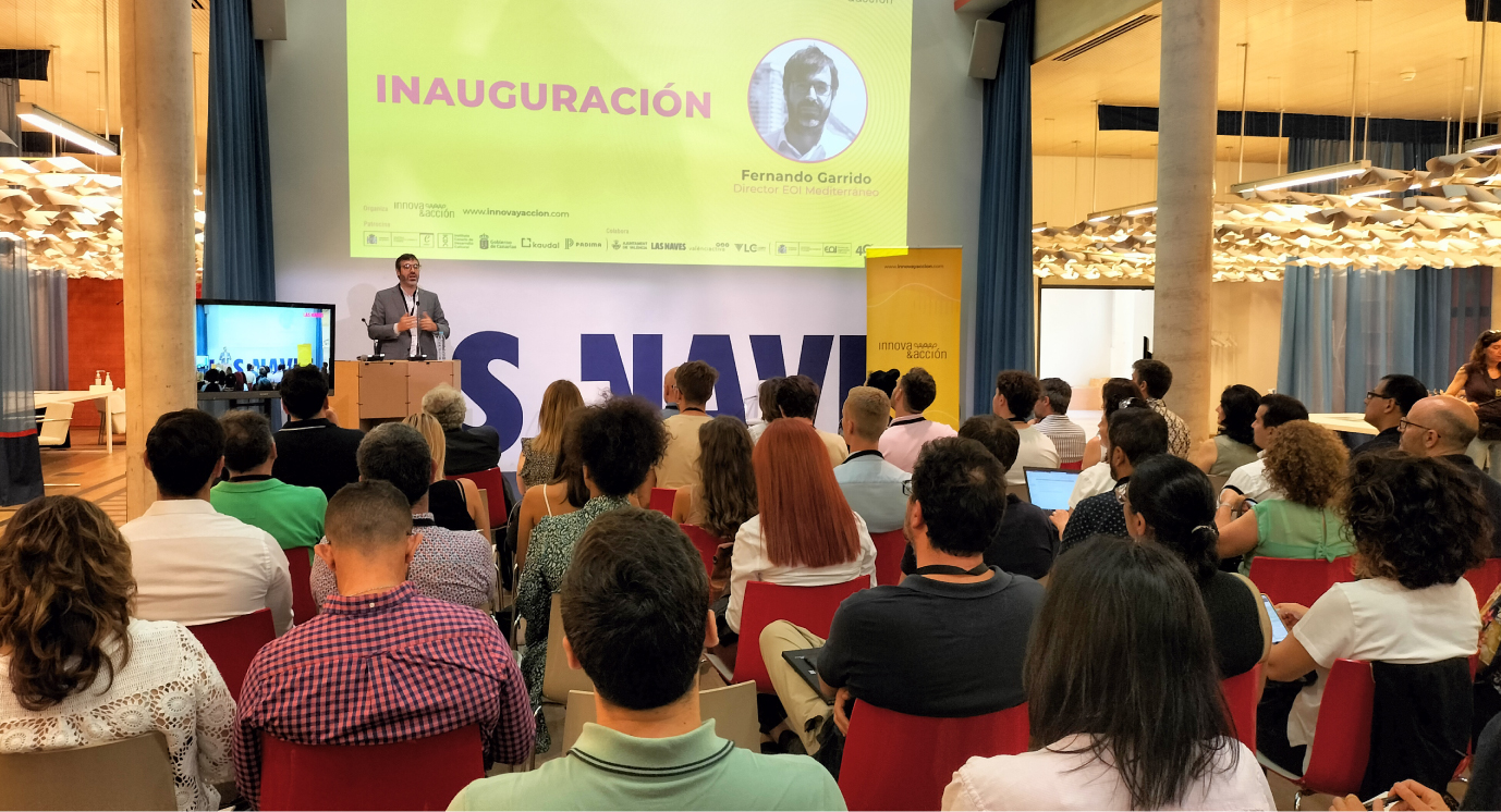 La tercera edición del foro inició con una motivadora y energizante bienvenida por parte de la anfitriona Marta Chillarón, directora del centro de innovación Las Naves del Ayuntamiento de València; Fernando Garrido, director de EOI Mediterráneo; y Olga Broto, directora de Innova&acción.