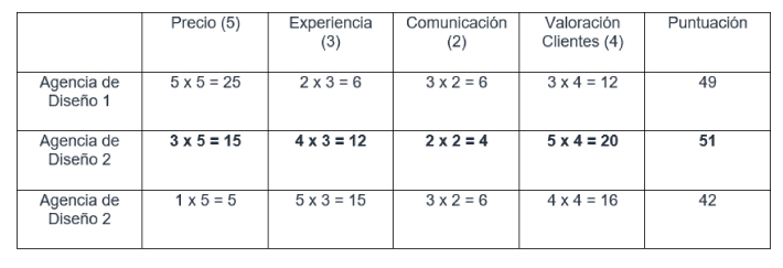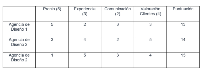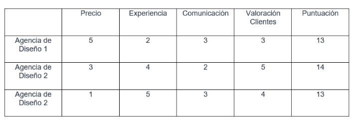 Siguiendo con el ejemplo, se decide que los criterios más importantes que afectan a la selección de una agencia de diseño son: el precio, la experiencia, la comunicación y la valoración de clientes anteriores.